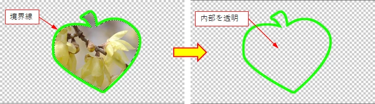 ②Photoshopに読み込んで、メニューの「編集」→「境界線を描く」から境界線を描き、内部を透明にして、.psdファイル形式で保存します。
