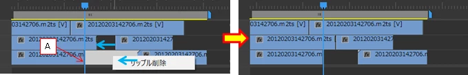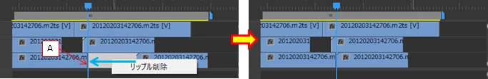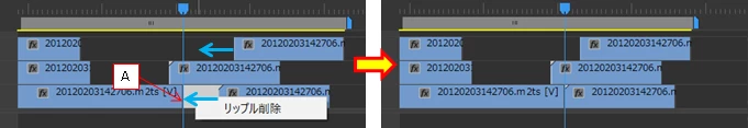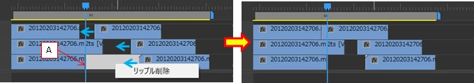 ①クリップがAより右にある場合は、一番間隙の少ない時間でリップル削除される。