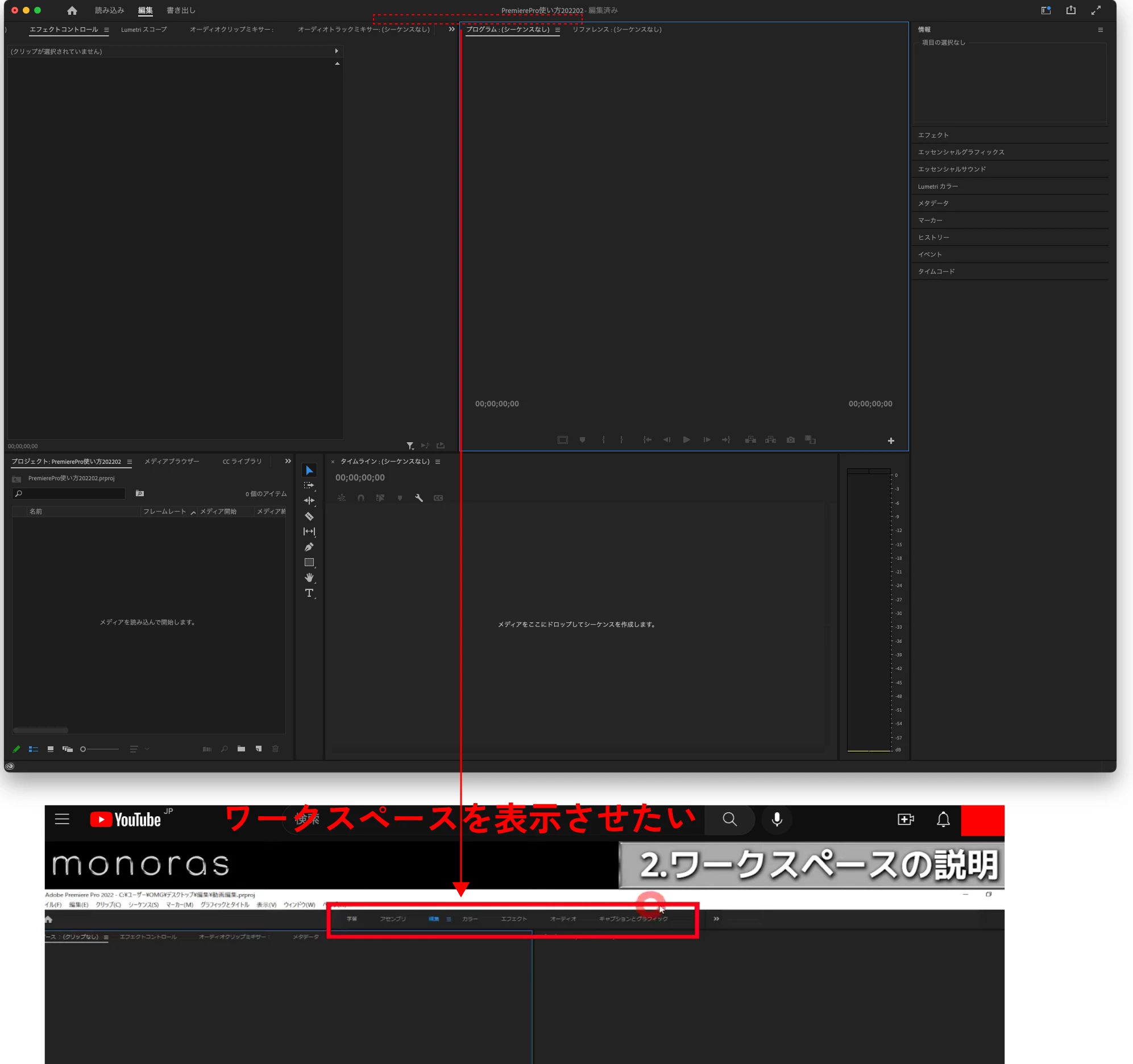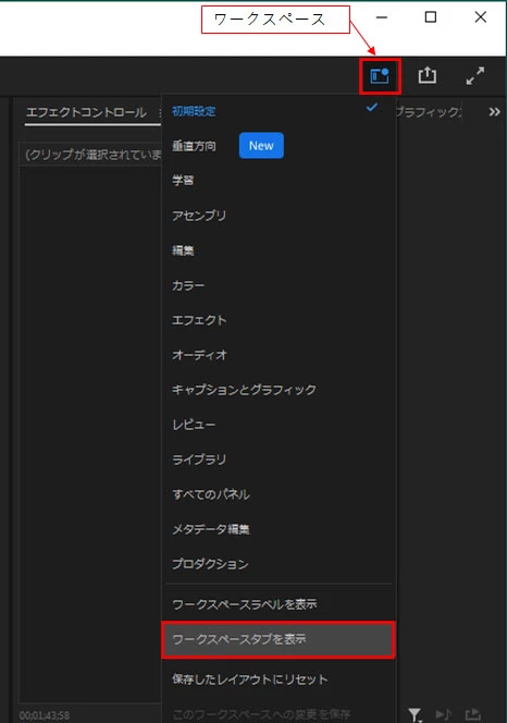 ①右上部の右から3番目の「ワークスペース」アイコンをクリックし、開いたメニューから「ワークスペースタブを表示」を選択します。
