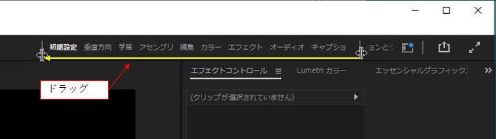 ②「ワークスペース」アイコンの左側に縦棒が表示されますので、左側へドラッグします。ワークスペースタブが引き出されます。