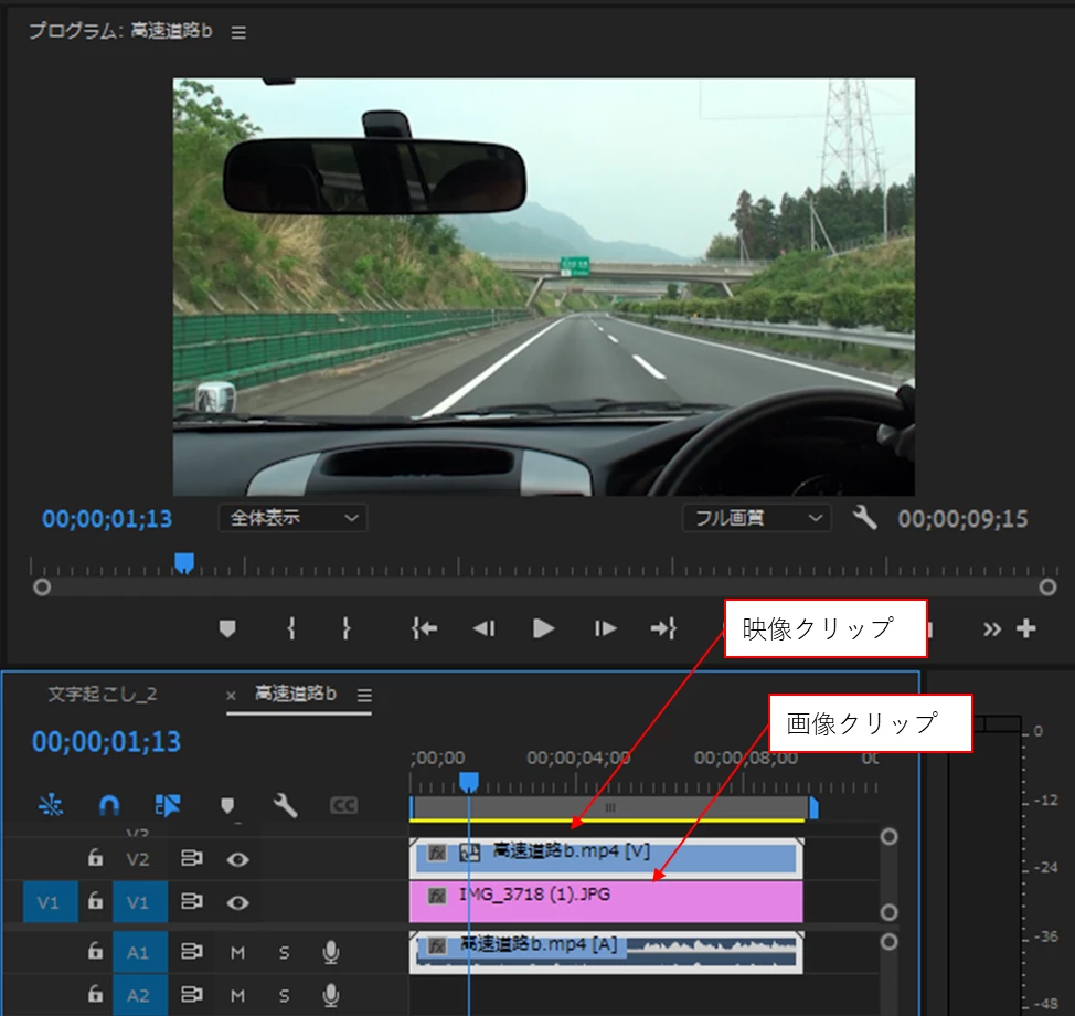 ②またはビデオクリップを下側のビデオトラックに移動し、画像クリップを上側のビデオトラックに移動します。すると、画像クリップが上に来ますので映像クリップの映像は隠れ、画像クリップの画像が見えてきます。
