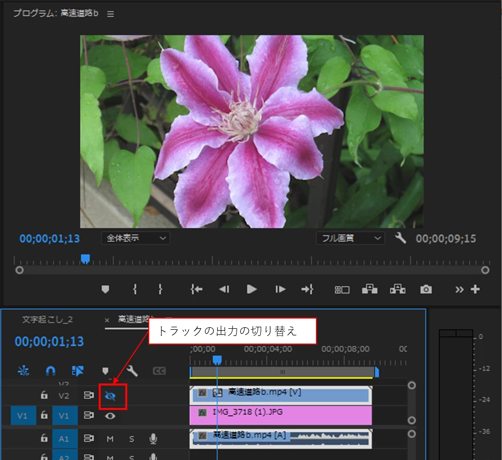 ①映像クリップのビデオトラックの「トラックの出力の切り替え」アイコンをクリックして「オン(青色)」にします。すると映像クリップのビデオトラックが無効になりますので映像は表示されず、画像クリップの画像が見えてきます。