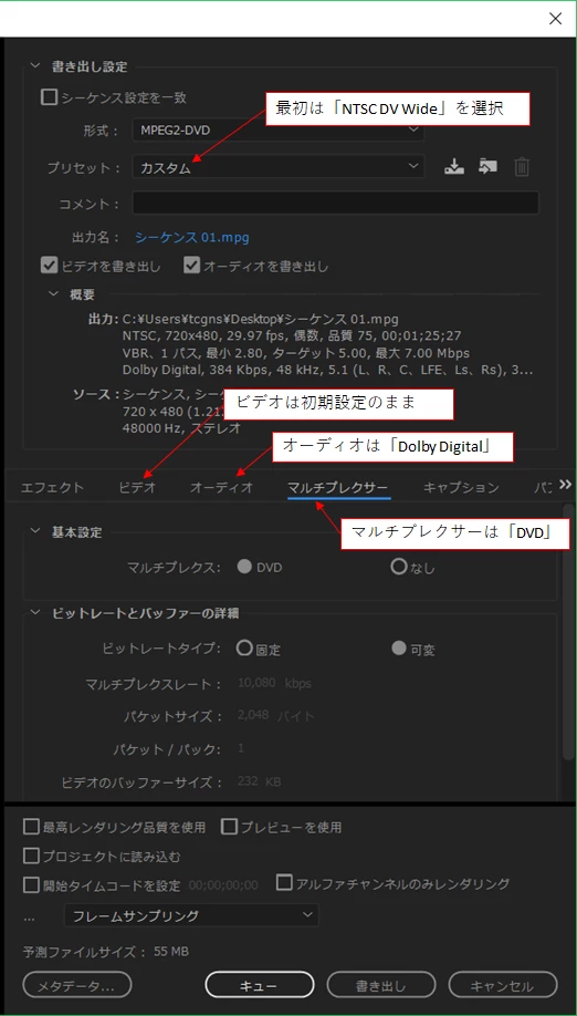 シーケンス設定は、プリセット「DV NTSC ワイドスクリーン 48 kHz」に設定します。