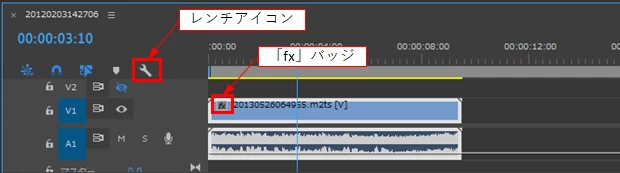 ①ビデオトラックのクリップに「fx」バッジが非表示の場合は、レンチアイコンをクリックし開いたメニューから「FXバッジを表示」を選択し、クリップの「fx」バッジを表示します。
