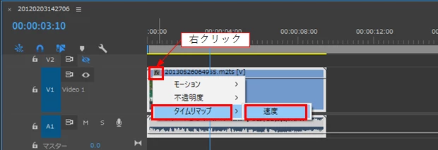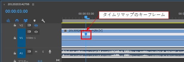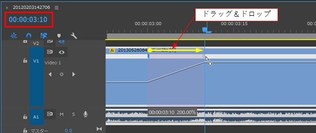 再生ヘッドを3秒10Fに移動し、タイムリマップのキーフレームの右半分の部分を再生ヘッドの位置までドラッグ&ドロップします。