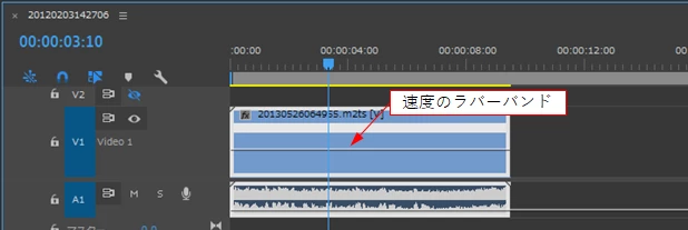 ③すると、タイムリマップの速度のラバーバンドが表示されます。この速度のラバーバンドは初期値では速度100%を示しています。