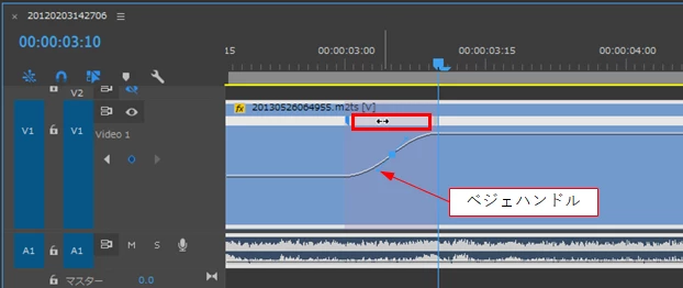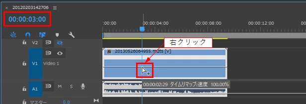 ④再生ヘッドを3秒00Fに移動し、「Ctrl」キーを押しながらカーソルをラバーバンドと再生ヘッドの交点付近へ移動し、下図赤枠部で示すように変わったらクリックします。