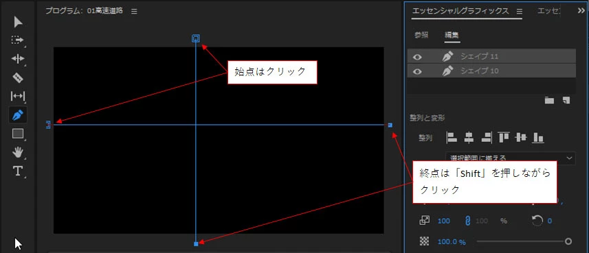 ②「ペンツール」で、まず、プログラムモニター左端外側でクリックして始点を作成し、次に右端外側で「Shift」キーを押しながらクリックします。すると水平パスが引けます。