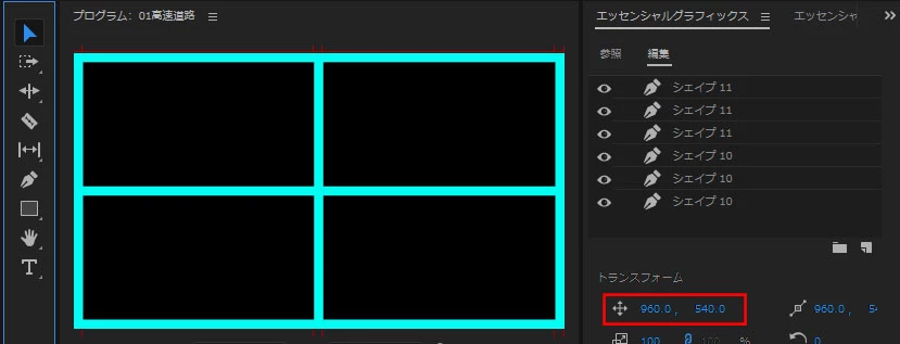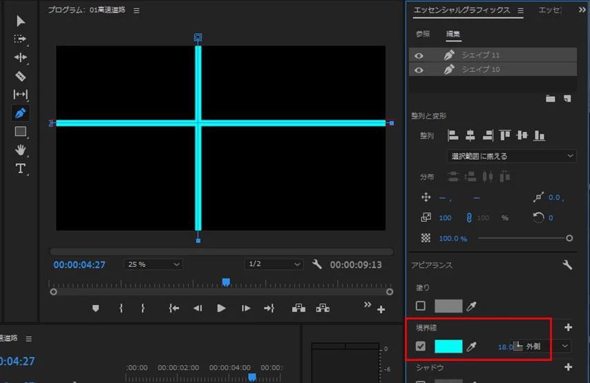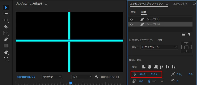 続いて、水平パスのシェイプレイヤーの選択を解除してから、上記と同様にして垂直パスを引きます。
