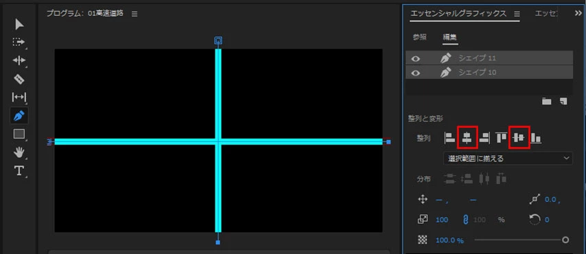 ④水平線、垂直線に対して、それぞれ「整列と変形」で「垂直方向に中央揃え」、「水平方向に中央揃え」ボタンをクリックします。