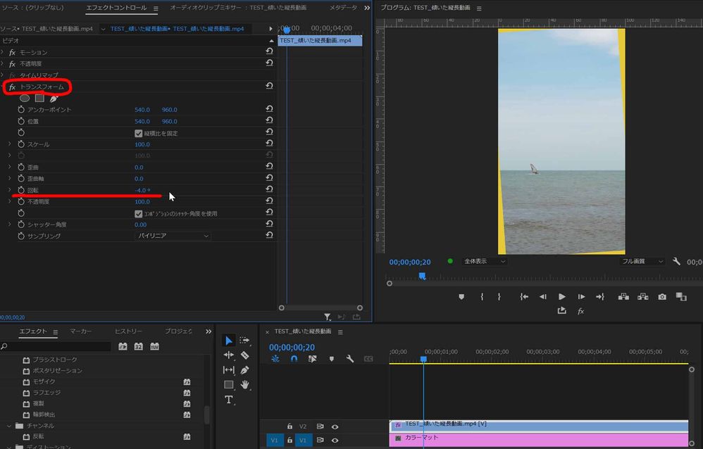 まず、トランスフォームエフェクトの回転で、傾きを修正します。