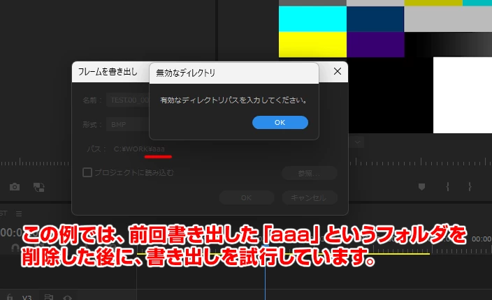 その後、「aaa」というフォルダを削除し、再度Premiere Proのプロジェクトを開いてフレーム書き出しをしようとすると、書き出し先の「aaa」というフォルダが存在しないために、エラーとなってしまいます。
