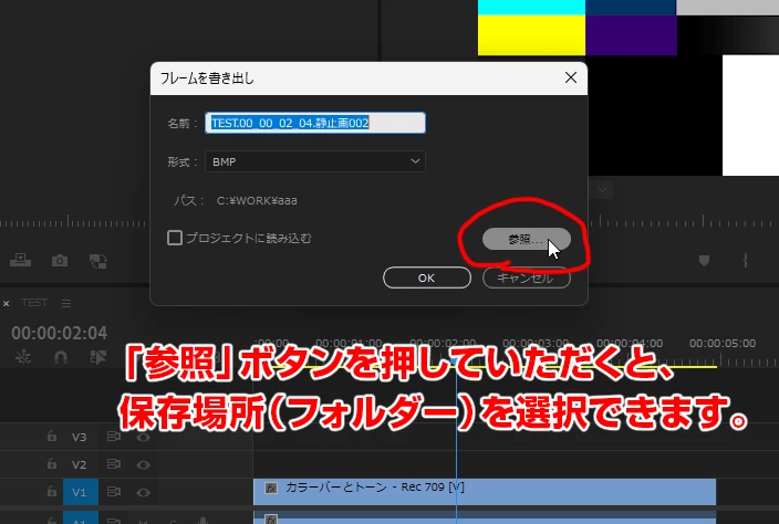 フレーム書き出しの保存先フォルダは、「参照」ボタンを押していただくことで選択できます。