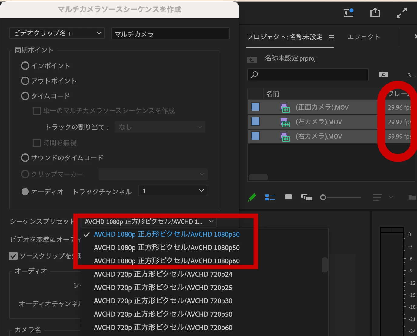 マルチカメラソースシーケンスを使って動画を作ろうと思いましたが、3本のうち一つが59.99fpsとなっています。他の2つはほぼ30です。