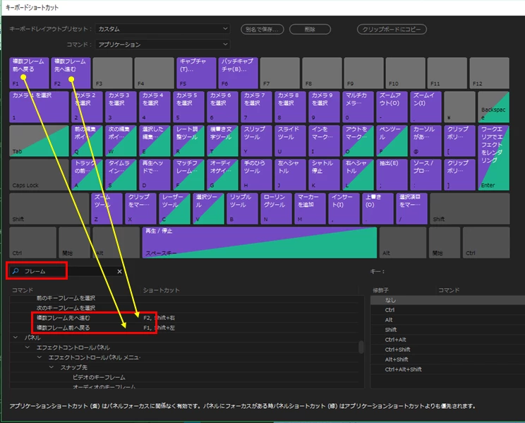 ③上側のF1、F2キーを、コマンド欄のそれぞれ「複数フレーム前へ戻る」、「複数フレーム先へ進む」へドラッグ&ドロップします。