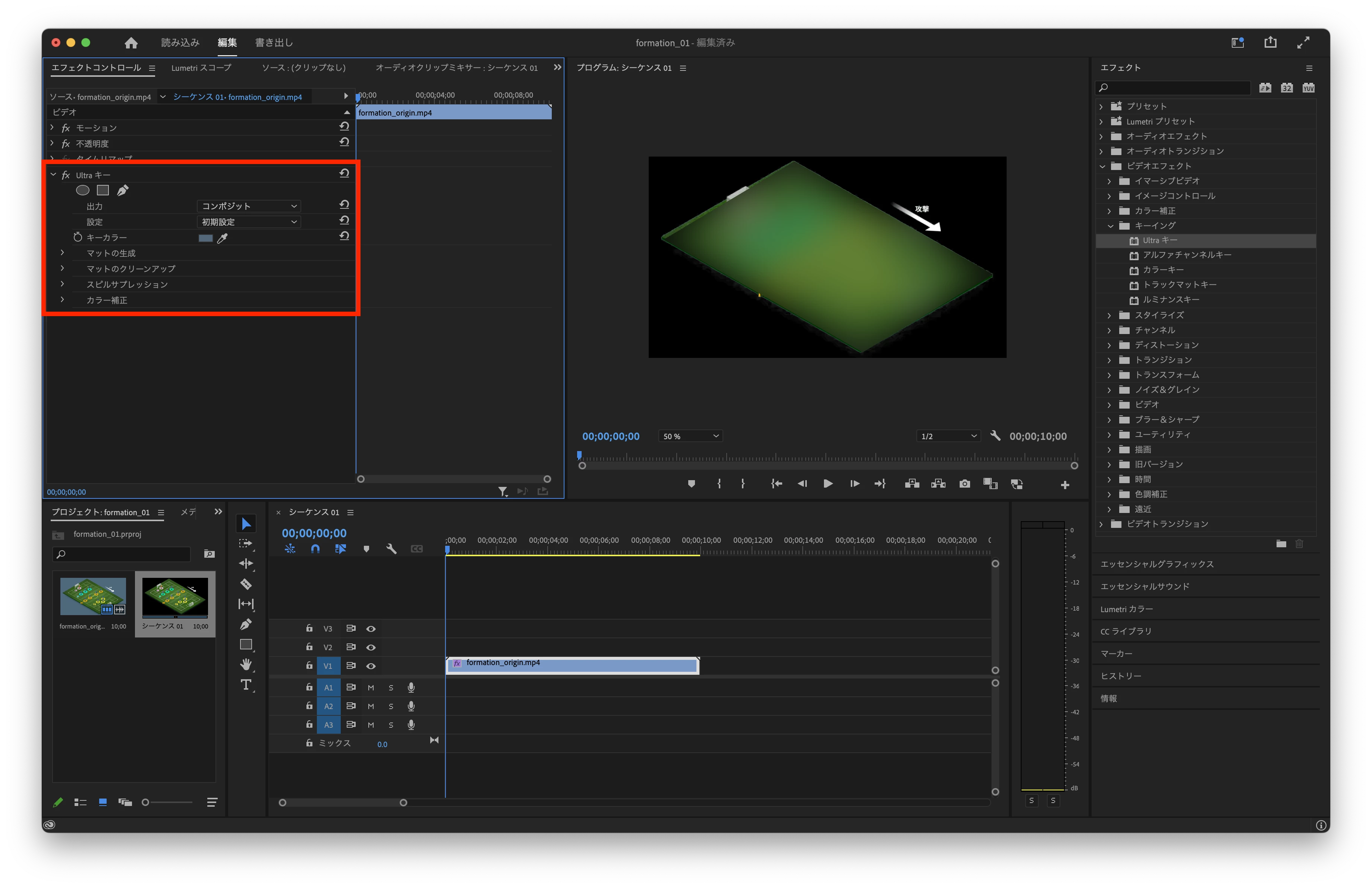 ②ビデオエフェクト「Ultraキー」を追加、背景色をスポイトで抽出