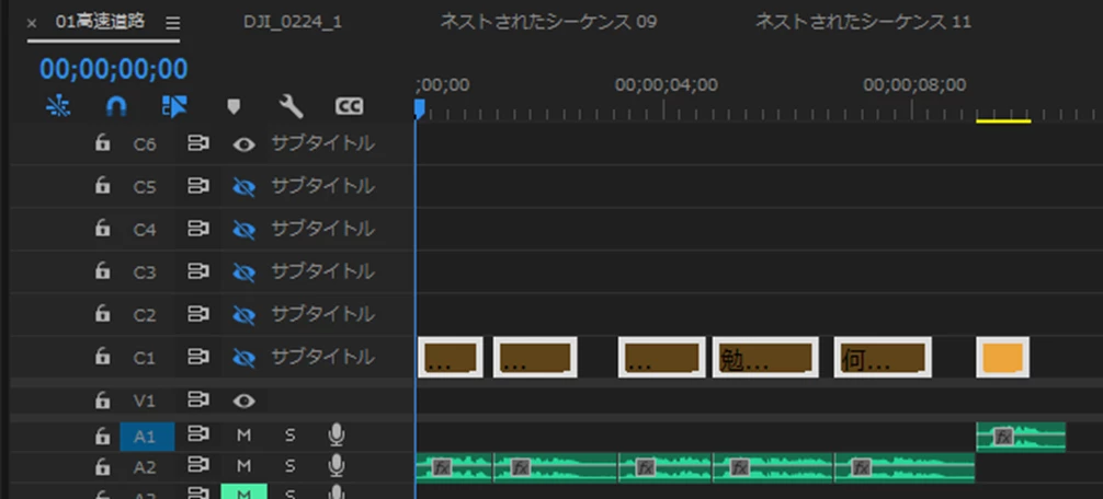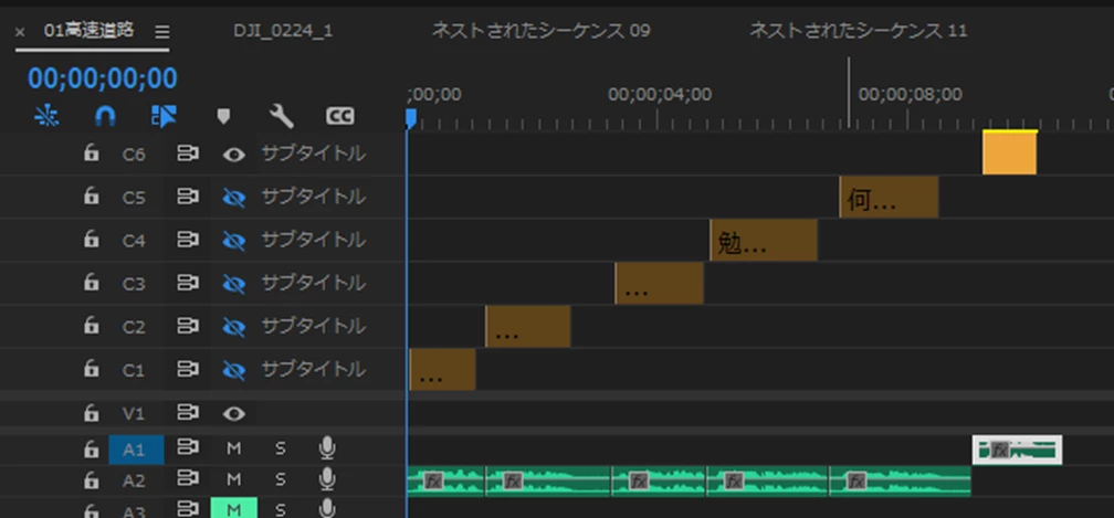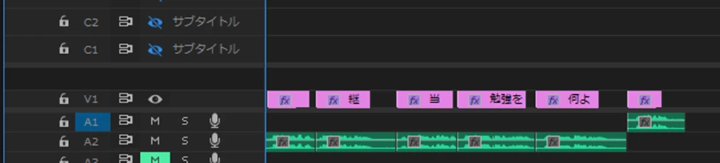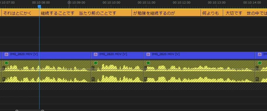 自動文字起こしからキャプションを作成すると、以下のようにキャプションがオーディオトラックの切れ目をまたいで生成されてしまいます。