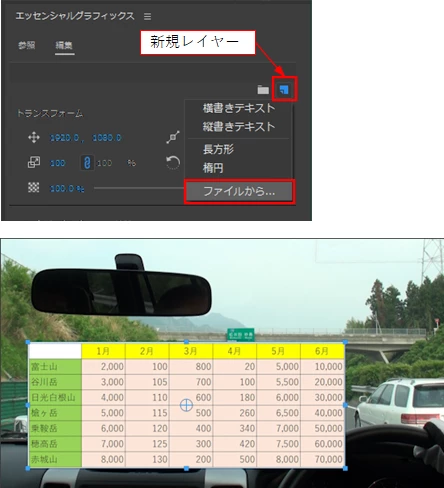 「エッセンシャルグラフィック」パネルで、「新規レイヤー」をクリックし開いたメニューから「ファイルから」を選択し、開いた「読み込み」ウィンドウで対象のファイルを指定し、「開く」をクリックすると、表が読み込まれます。