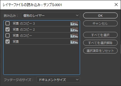 複数のPSDファイルを一括(PSDファイルをすべて選択)で読み込んだ場合は、ファイル数分パネルが開きますが、全て同じオプション(例:シーケンス、ドキュメント)である場合、1回のオプション選択で残りの全PSDを一括で読み込み事は出来ないのでしょうか?