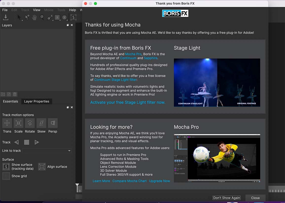 After Effectsを起動させて、エフェクトのMochaを動作させると、Boris FX社のユーザー登録を促す画面が出ます。
