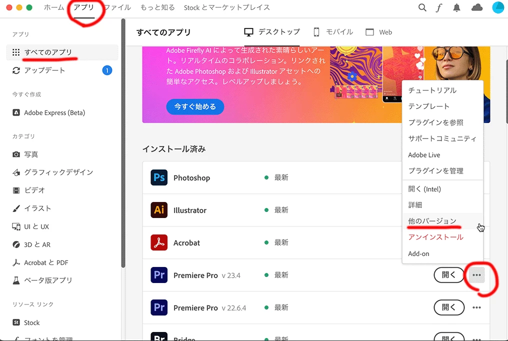 ④旧バージョンのPremiere Pro (v22.x)のインストール