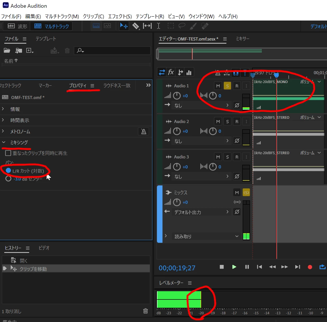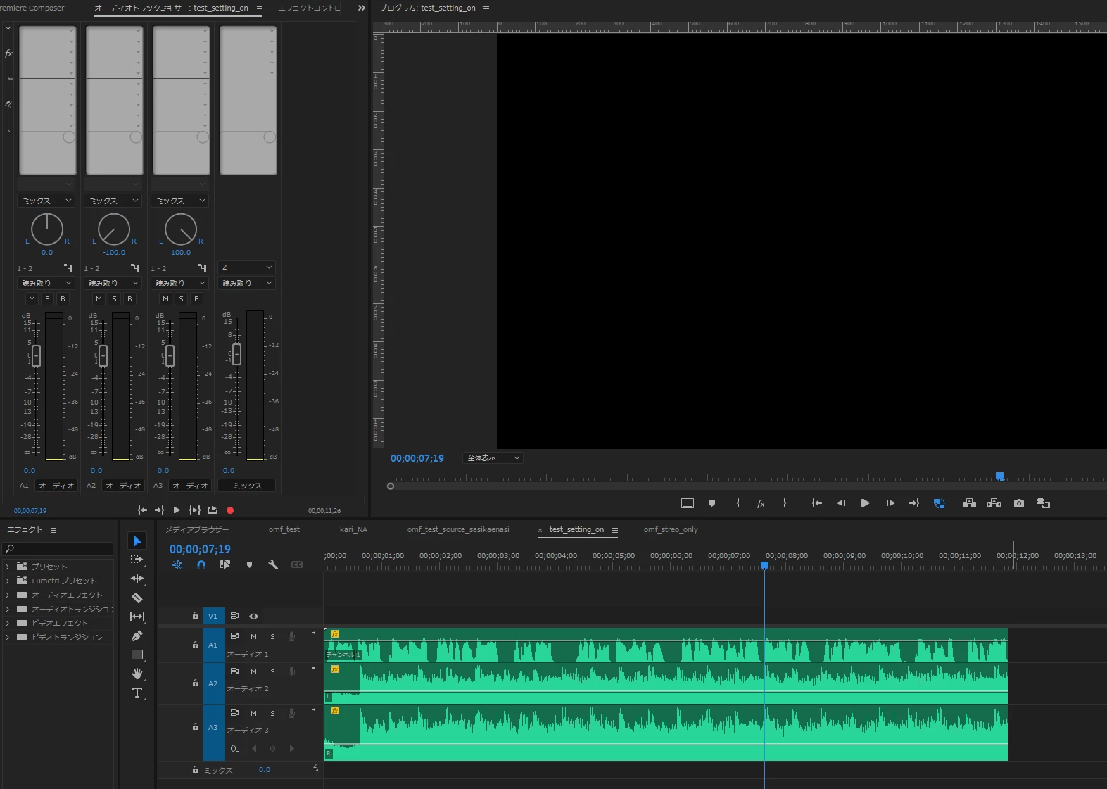 オーディオ1…仮NAを配置するのでモノラル、パンバランス0