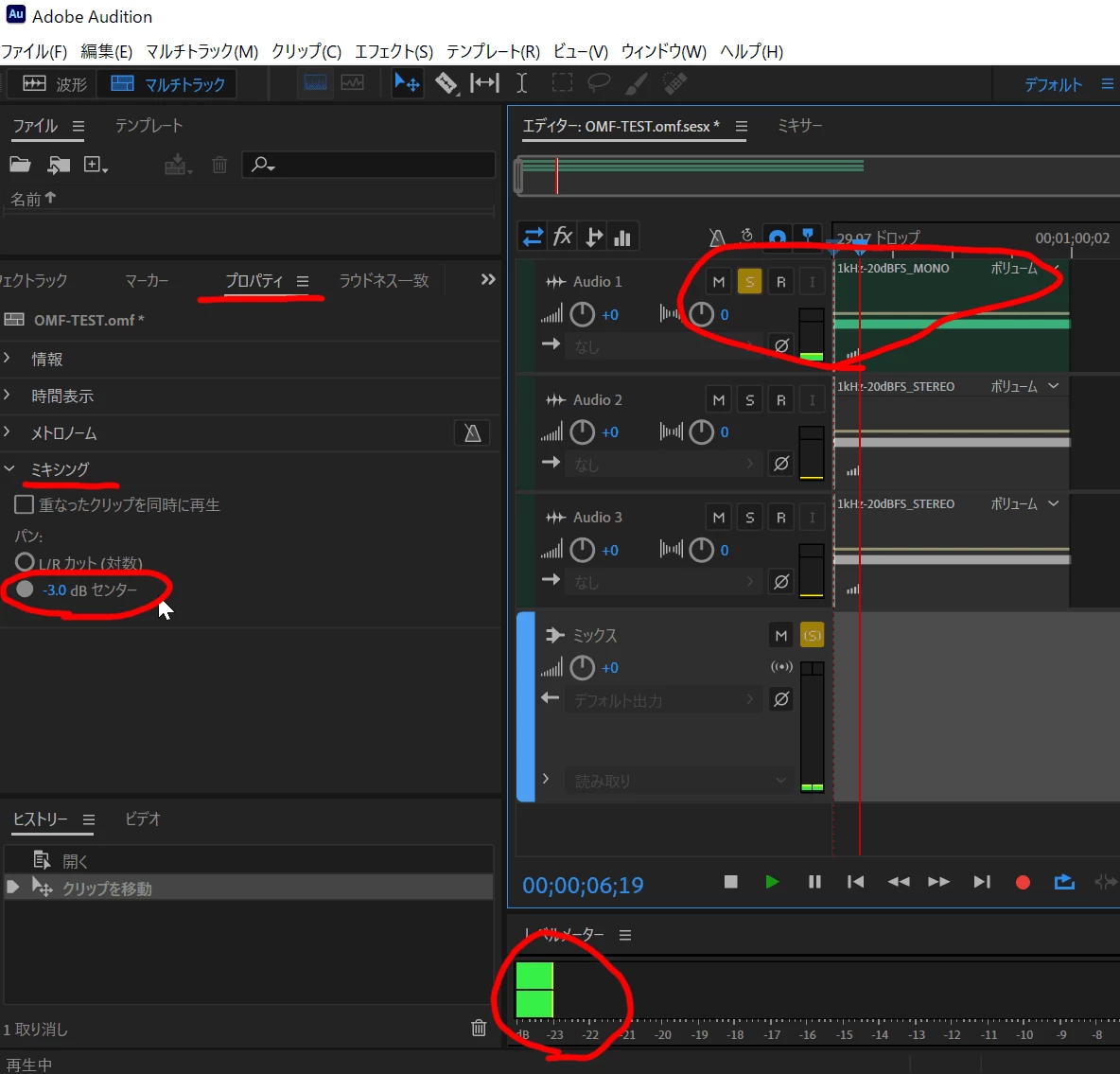 仮NAの方がシーケンスとOMFで-2~3dBほど下がり、BGMの方は2~3dB音量が上がってしまいます。※OMFの確認はAuditionで確認しています。