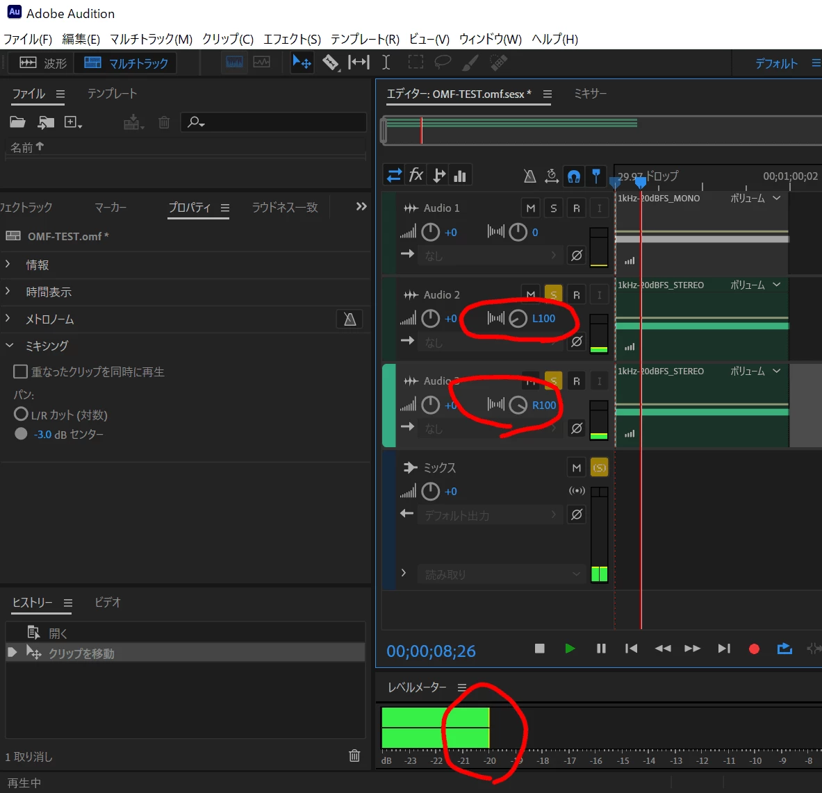 オーディオ3…BGMのRトラックを配置するのでモノラル、パンバランス100