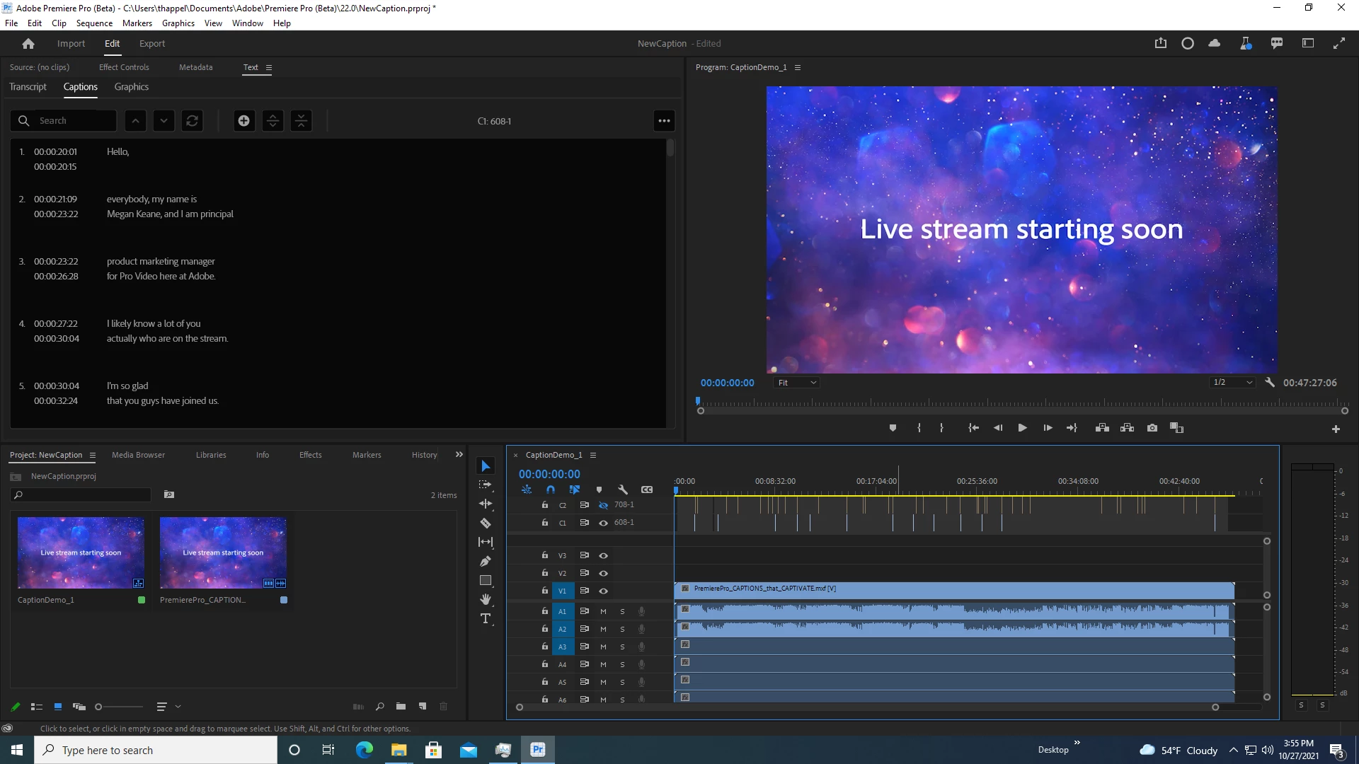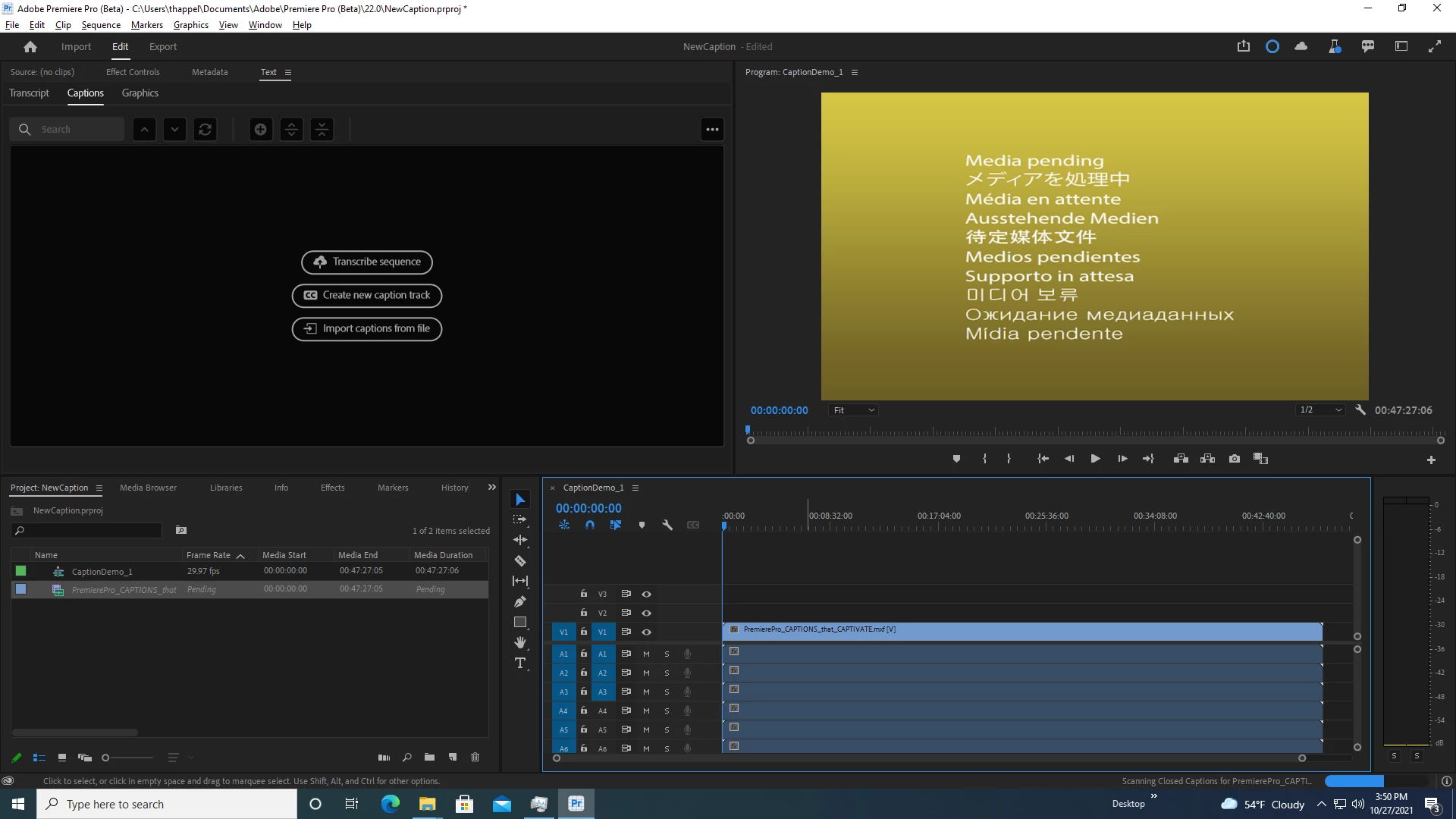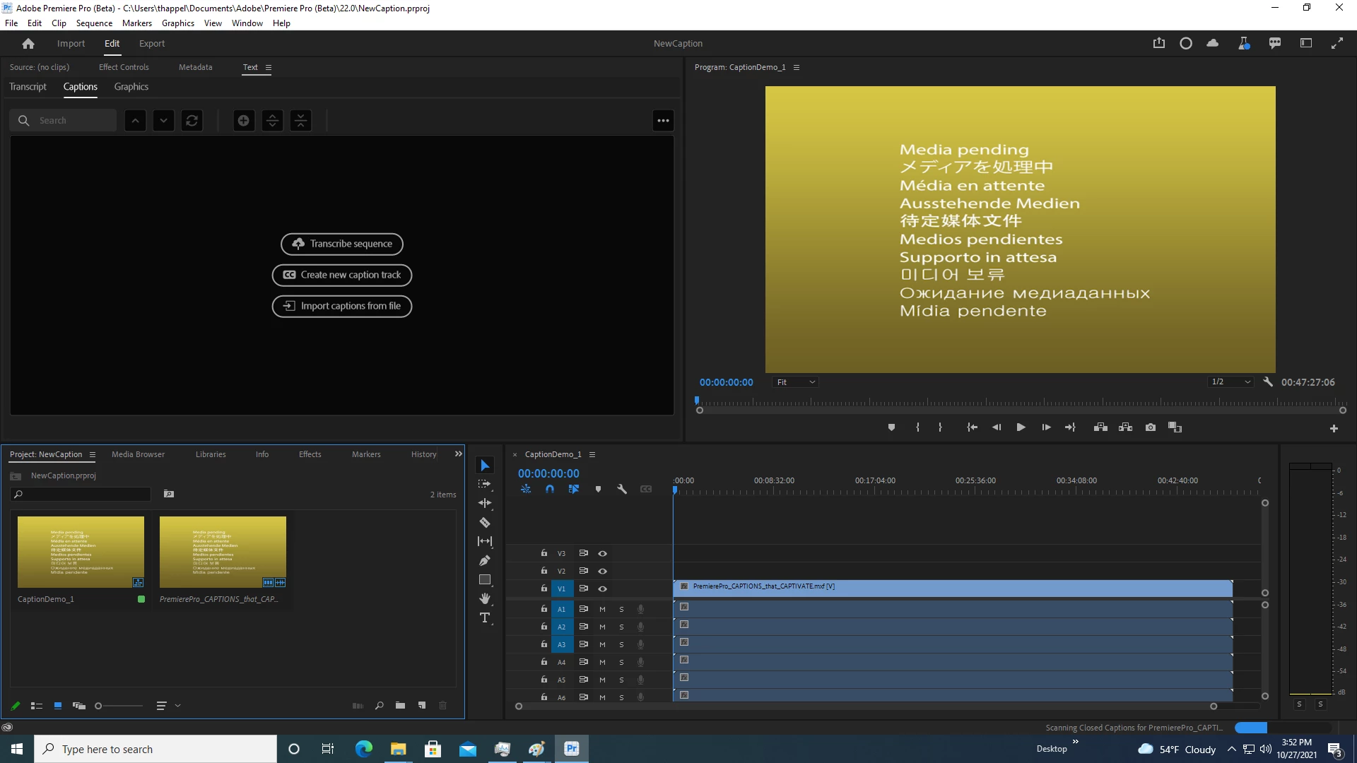 With Premiere Pro 22.1 Beta, when you import embedded Caption clips, they should import fairly quickly, and you will notice “Scanning Closed Captions” text and progress bar in the lower right of Premiere Pro (same area as where we report Peak File Generation).