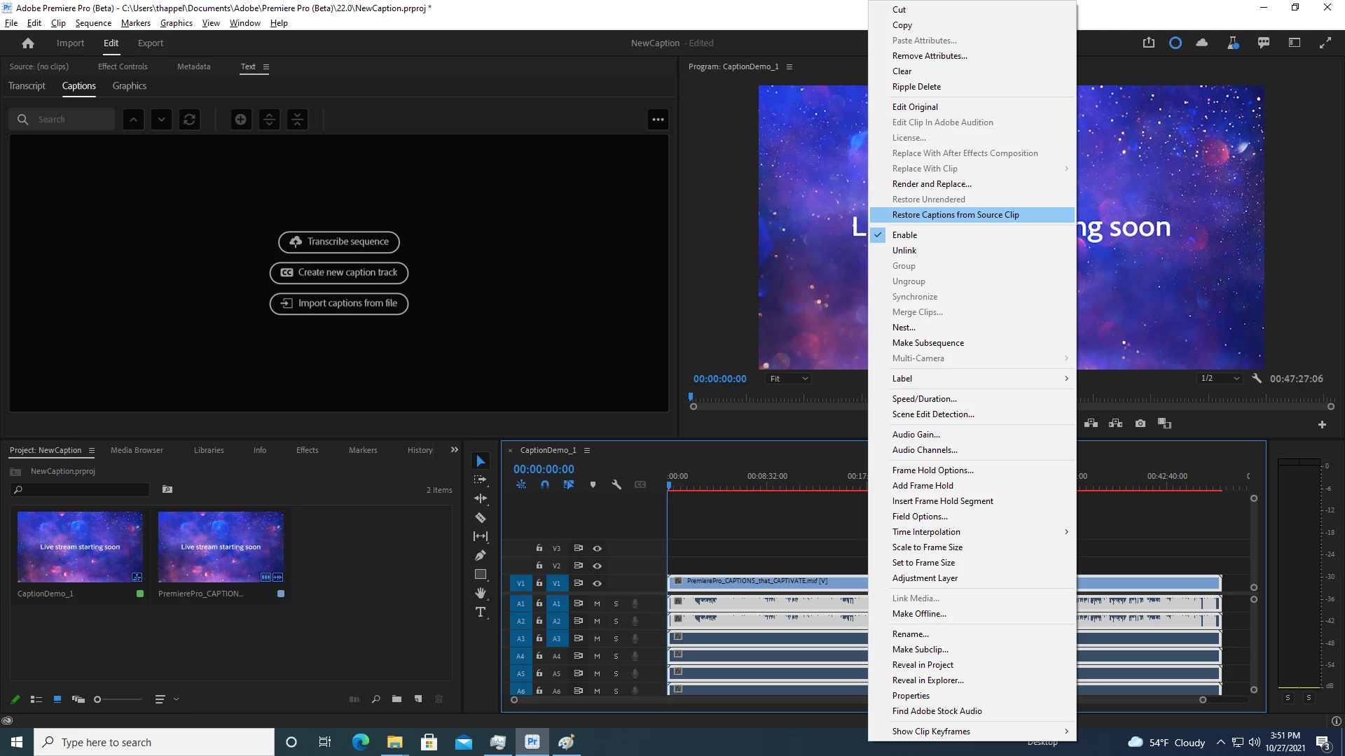 For Sequence that you added while Media Pending, once Scanning is complete, you can right-click on A/V in Timeline Sequence and choose “Restore Captions from Source Clip” (also available under Clip menu and unassigned shortcut). This will add the Caption track(s) from the source clip. This is a per clip action, so if you cut up your embedded Caption into multiple clip segments or added multiple Media Pending clips, then you need to select each one (in the Timeline) that you wish to Restore Captions.