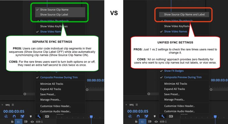 I agree 100% that whenever it's beneficial, it's worth reducing complexity as much as possible. I just don't think that's the case here. There's a very real reason to want to sync names but not labels. The amount of complexity this would add would probably be negligible at best, if not wholly non-existent for most users. After all, how simple-minded are we presuming Pr editors to be if we imagine they can handle a "Show Source Clip and Label" option but not "Show Source Clip" + "Show Source Label" despite the benefits? If anything, 2 separate, side-by-side options might be ever easier to understand, since turning one option on/off would only affect one thing at a time.