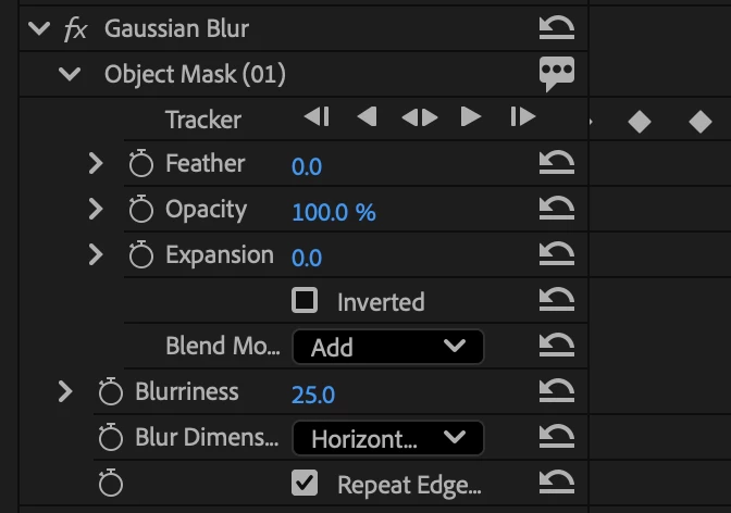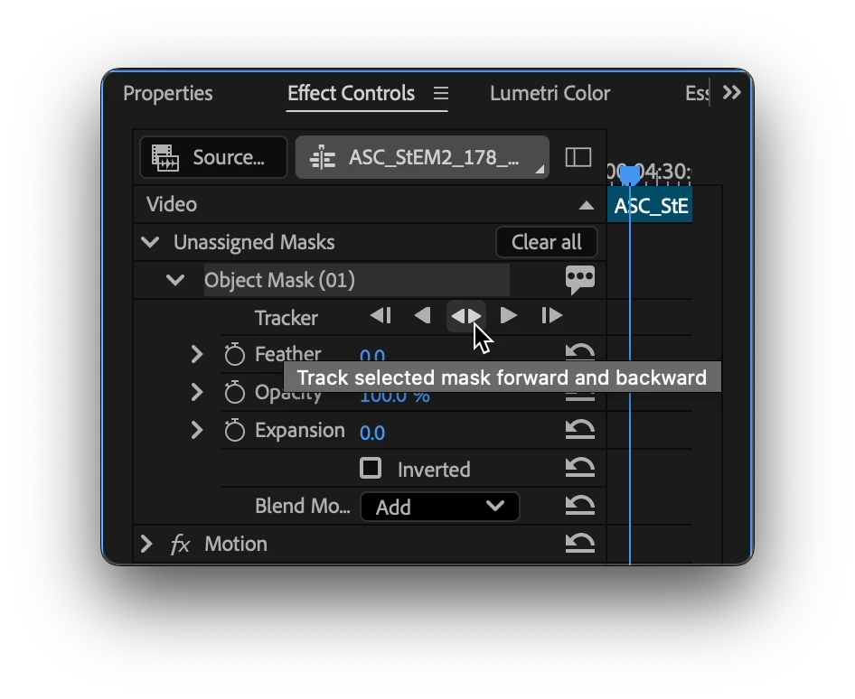 - Track the motion. Find the new “Object Mask” in the “Unassigned Masks” section of the Effect Controls Panel. Click on the forward and back button.