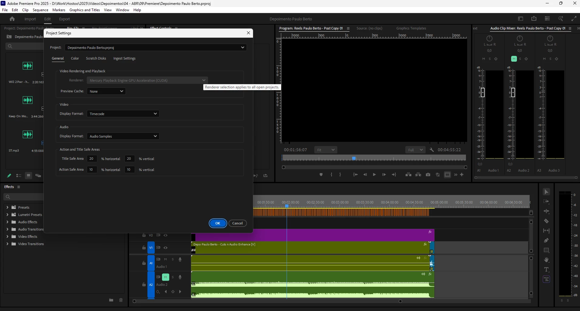 What I couldn't do was testing changing the settings in Project Settings window, because the option to change the renderer is locked and grayed. It's locked in Mercury Playback Engine GPU Acceleration CUDA.