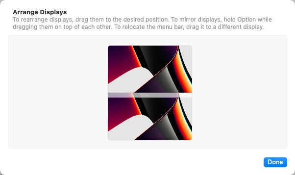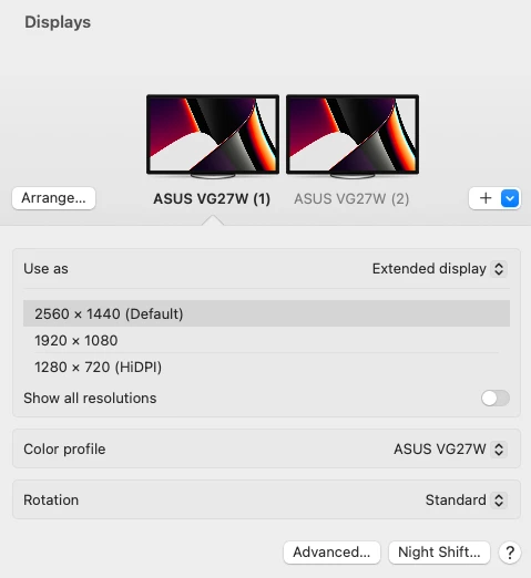 My primary monitor is the bottom monitor in this stacked setup, and both monitors are at a 2K resolution.