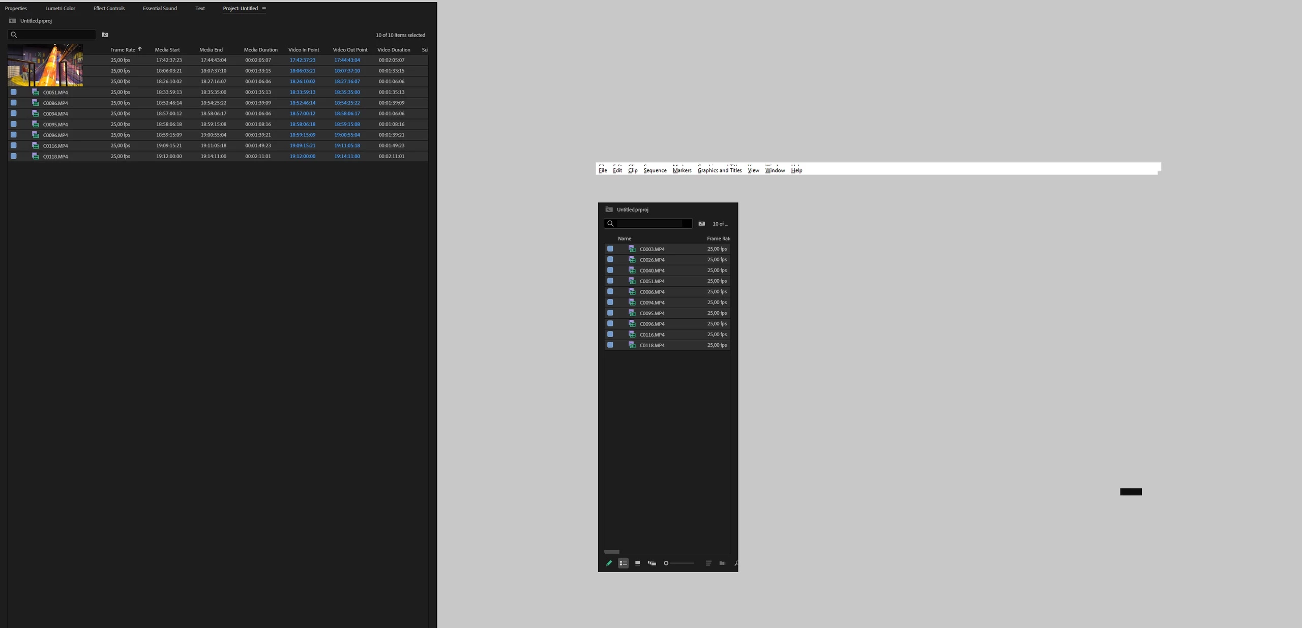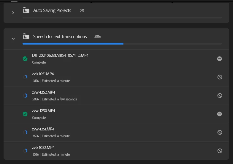 Open Premiere Pro, import several video files (3840 x 2160, 23,976 fps, MP4 H.264 4:2:0), select them all, choose Transcribe.