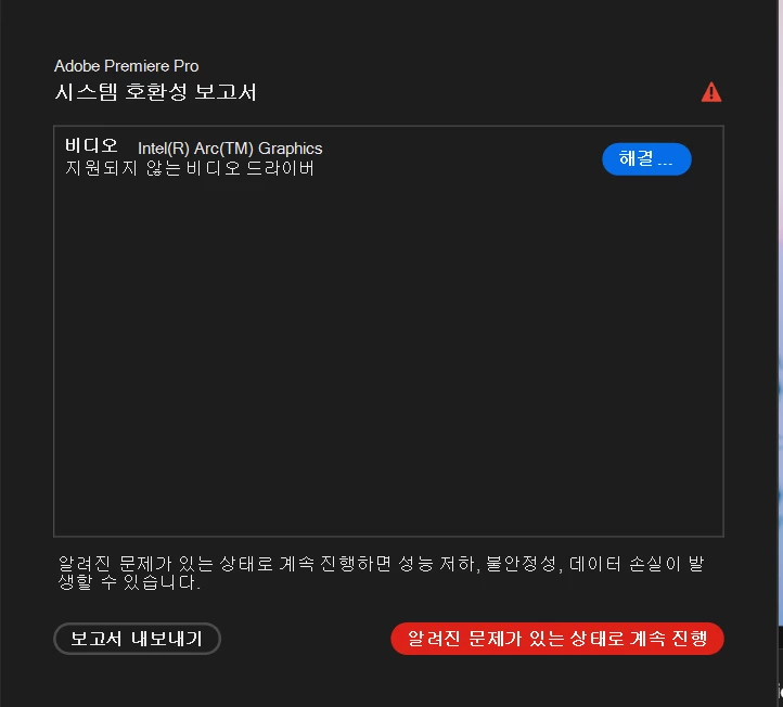 현재 사용 중으로 확인되시는 Intel Arc Graphics 그래픽 드라이버에 관해 호환성 문제가 알려져 관련 내용을 내부 확인 중에 있습니다!
