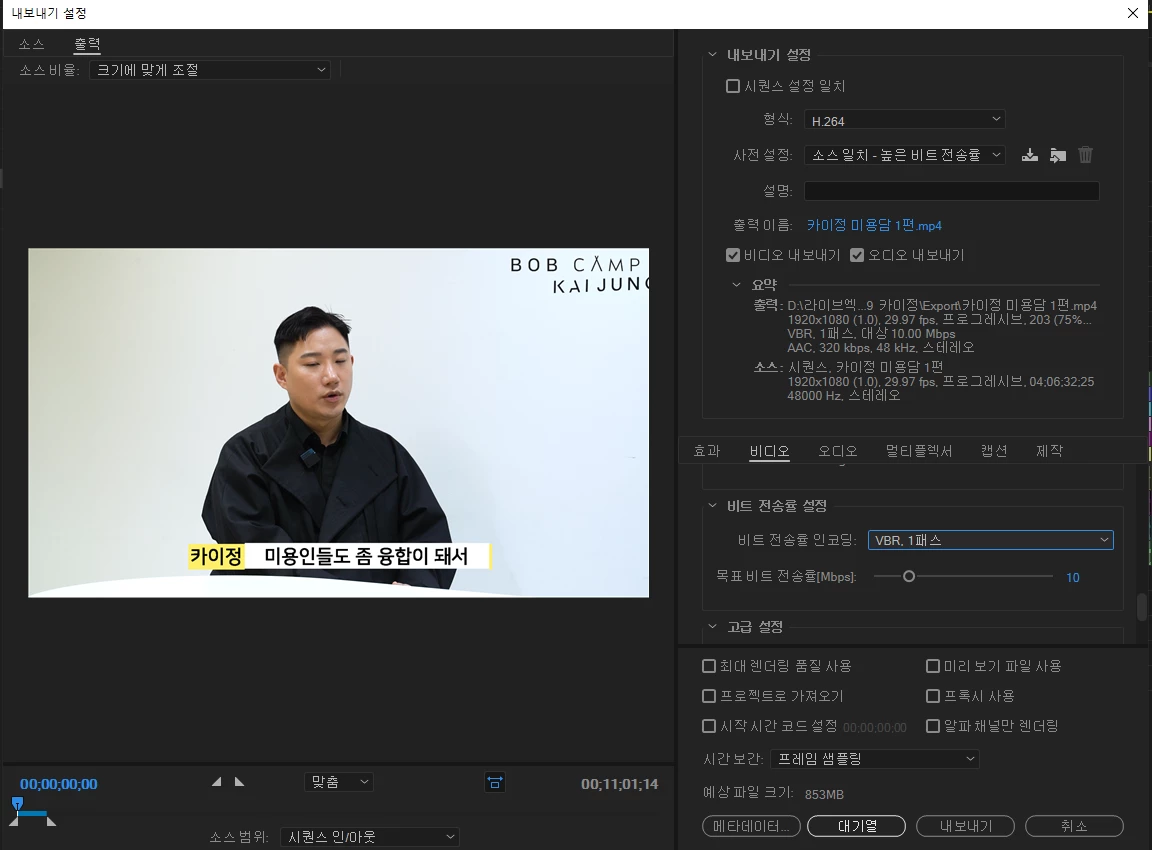 <내보내기, Export >영상을 뽑는 과정 중 프리미어 프로는 CBR, VBR 두가지 다 제공합니다.