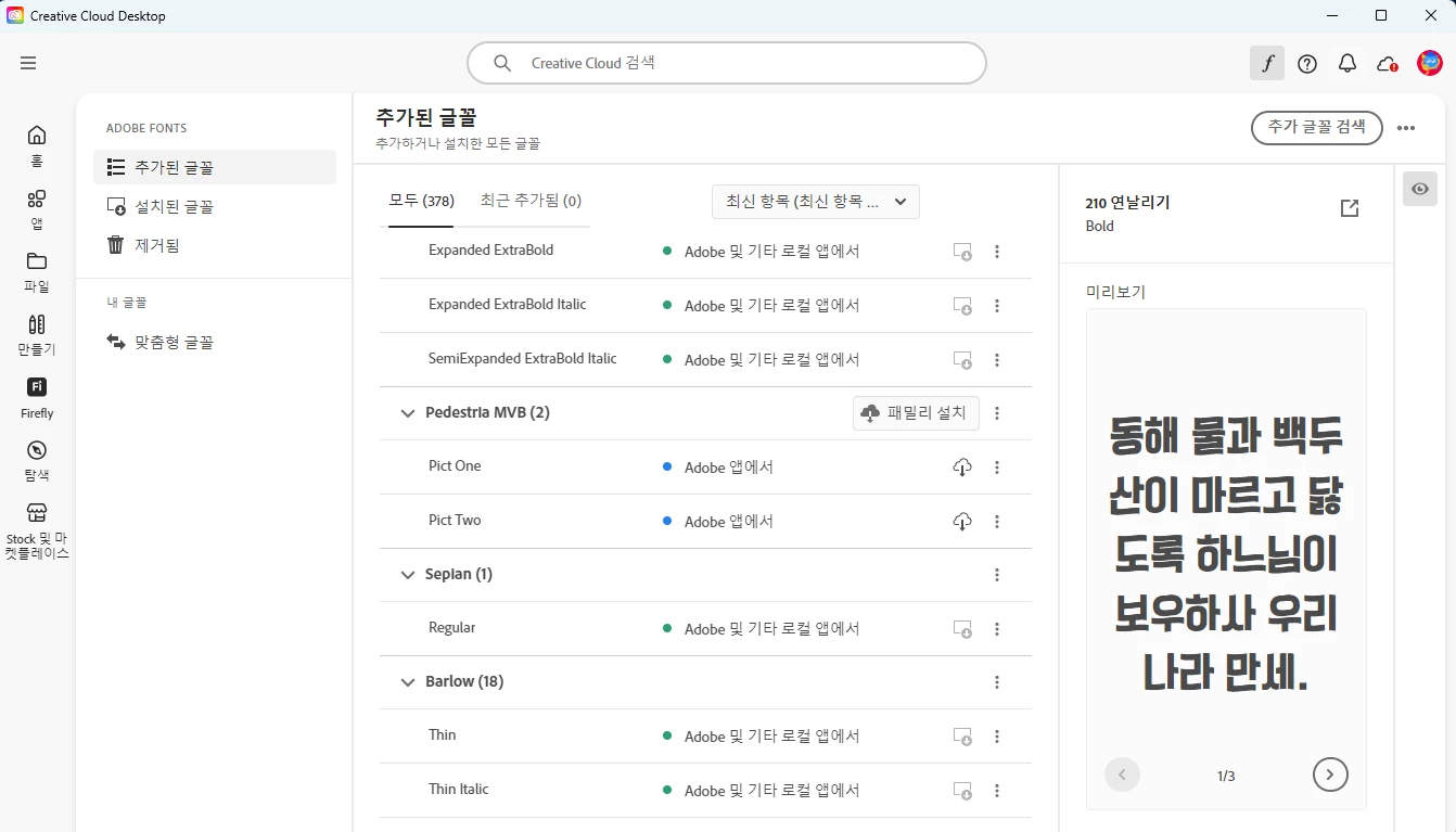 어도비 크리에이티브 클라우드 데스크톱 앱에서 폰트메뉴로 들어가서 지금 하단의 이미지 속에 보이는 폰트들의 패밀리 설치를 진행해보실것을 권장 드리겠습니다.