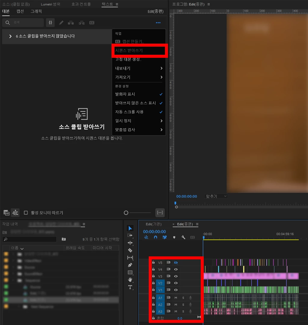 텍스트 대본 기능 중 시퀀스 받아쓰기 기능 실행 불가능