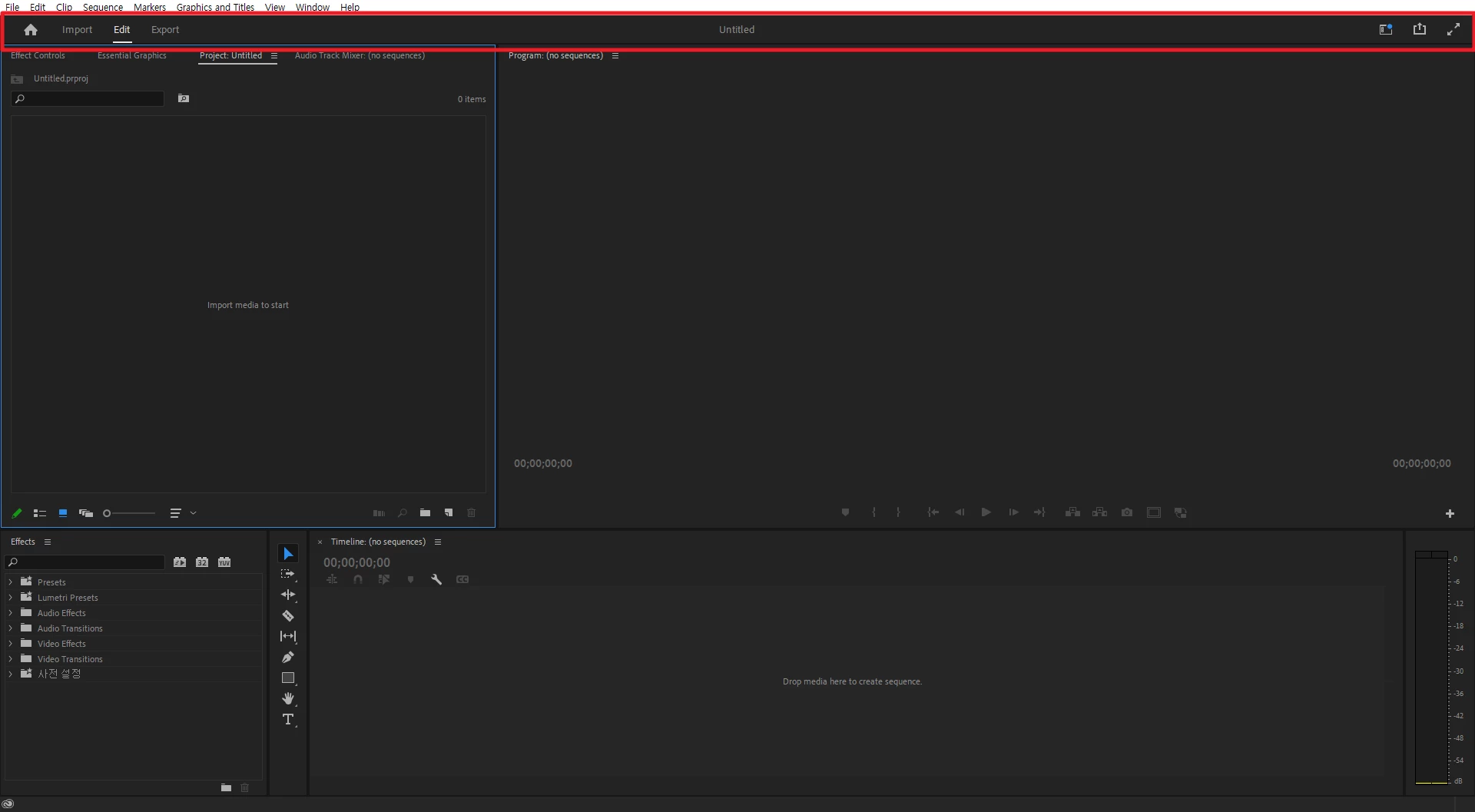 프리미어 워크스페이스 상단에 있는 바 어떻게 없애나요?
