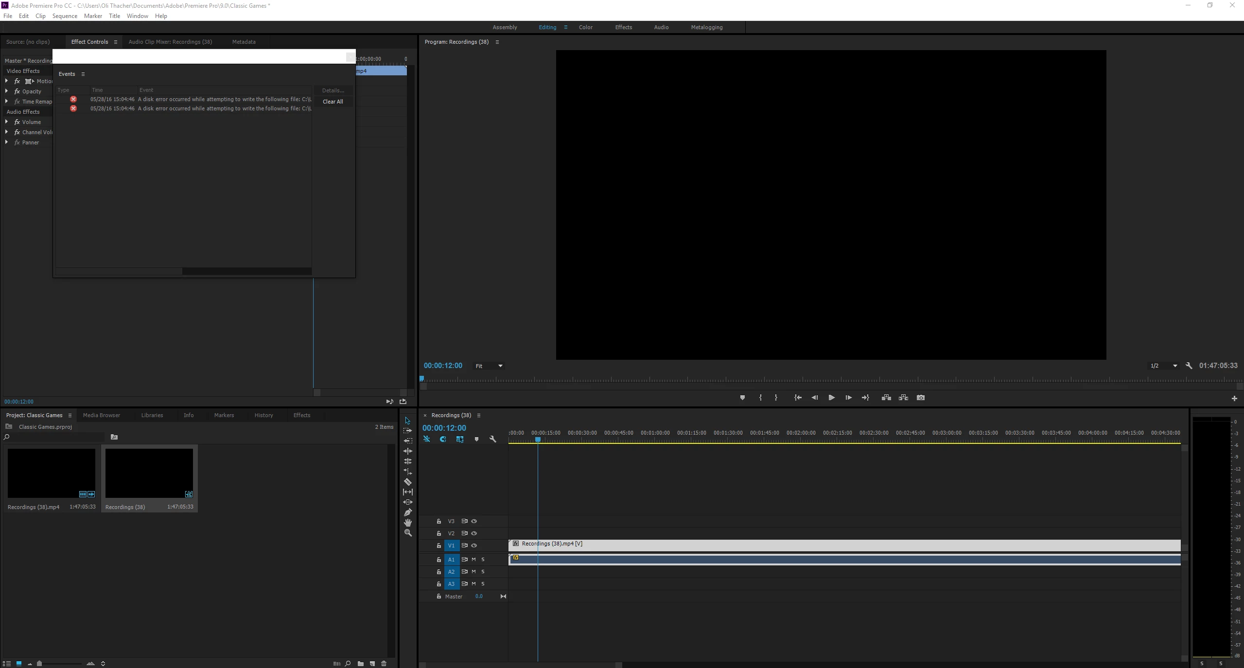 I was working on my video and i put in a video file and a 10 seconds later i get an error saying  "a disk error occurred while attempting to write the following file"