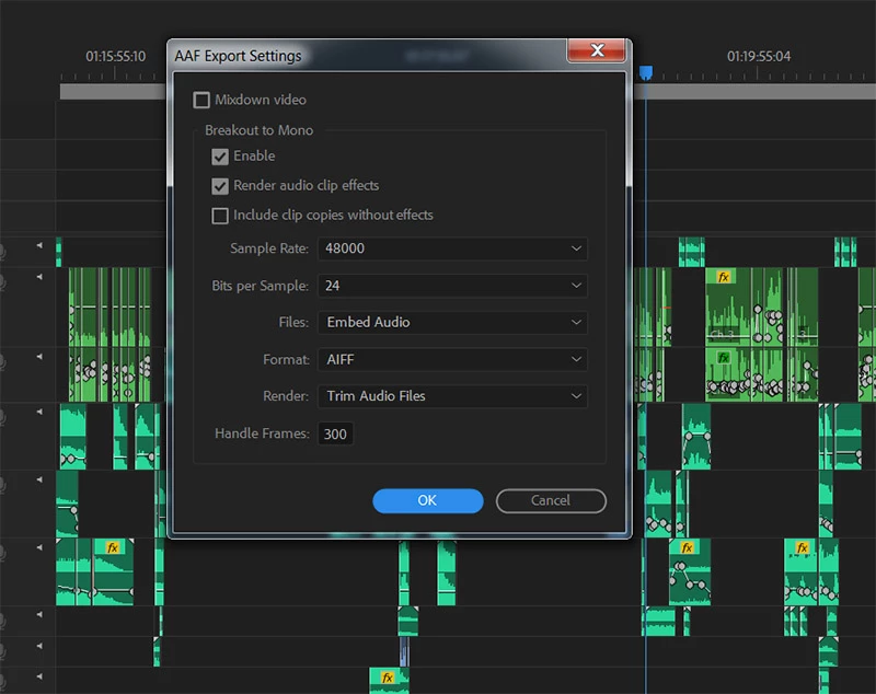 I'm exporting an AAF out of Premiere CC 2018. When I did it a few days ago, it worked fine and the audio keyframes showed up when the AAF was opened in Pro Tools. However, a new AAF from the same project now is showing up in Pro Tools without all of those keyframes, and the AAF file now is 10GB, while it was 16GB before. I don't think I changed the settings from before to now. Here are the AAF settings in Premiere - you can see the project's rubberbands in the audio files in the background.