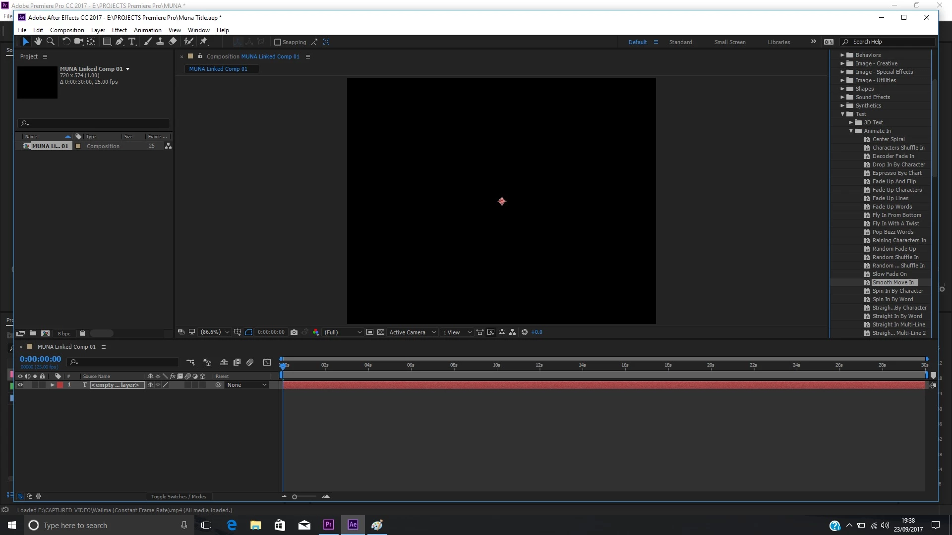 I will be very grateful if someone can solve my problem. I am trying to use the Text Presets in After Effects by using the Adobe Dynamic Link in Premiere Pro. So in Premiere Pro, I go to File, Adobe Dynamic Link and New After Effects Composition. When I am in After Effects and I have selected one of the Text Presets from Effects and Presets, I cannot see the sample text or the anchor points in the window for any Preset I select. I can't even see the animation when I move the play head in the time line and I can't enter new text either. When double clicking on a Preset, the Preset appears in the Window as shown in the screen shot below. Any help will be very much appreciated.