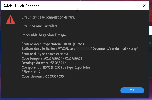 With Media Encoder I got no info about the crash... the software simply stop responding. On adobe Premier pro, I got an error code 1609629695. I'm curently trying a software export instead of mercury engin, but it say 200h for rendering, witch is not an option.
