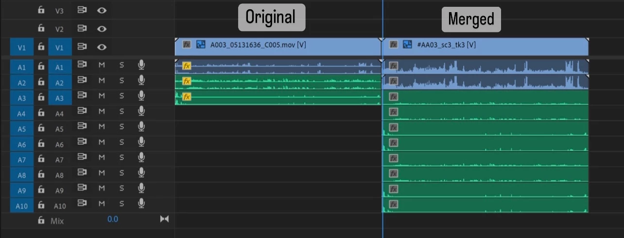 The Lav mics were rode go's version 1 so I had to interpret footage to make the left and right audio channels (2 Lav mics) into two separate audio tracks with their own left and right channels. I think this has something to do with the reason merged files duplicates like crazy but how do I fix it??