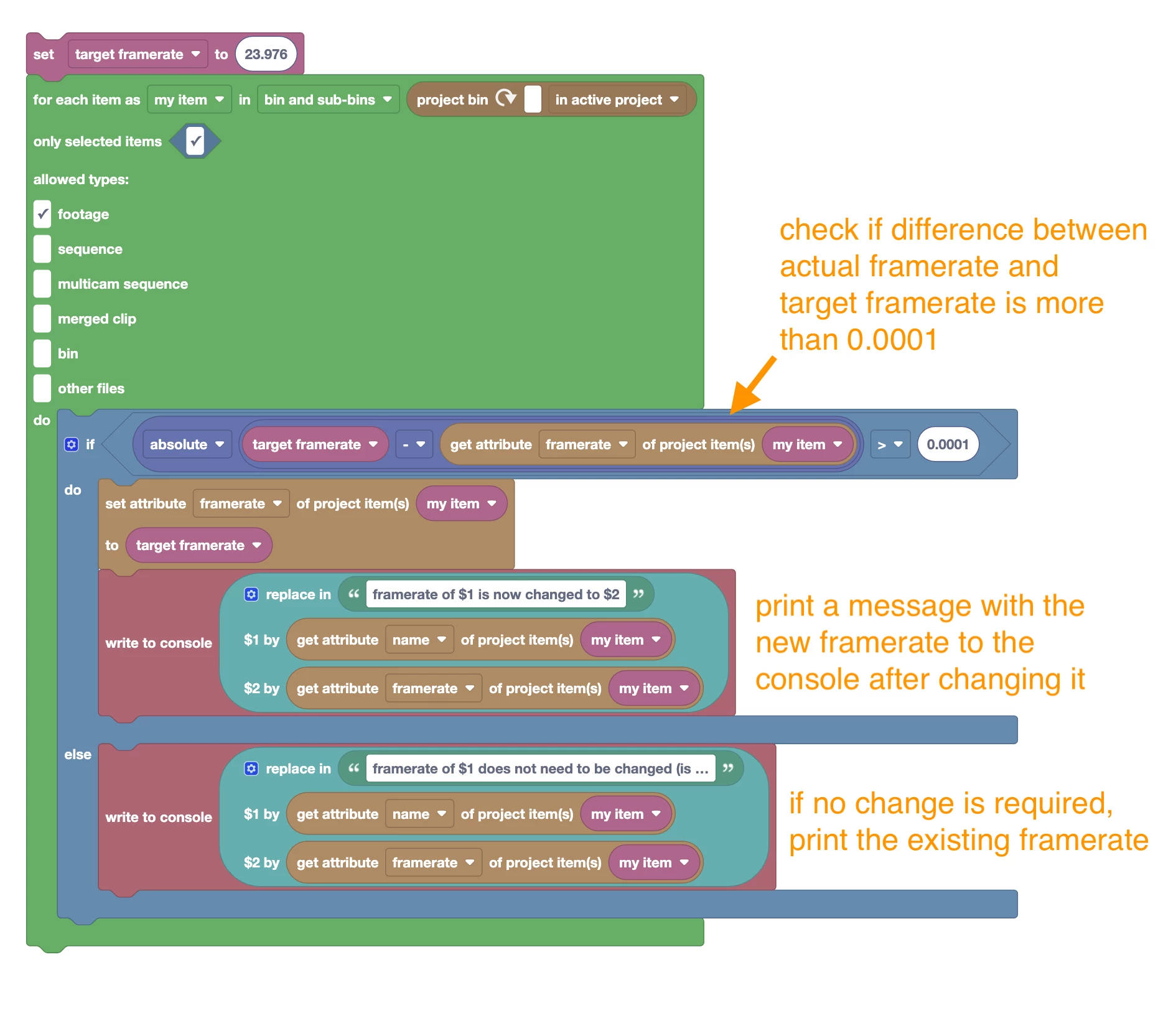 Now it only sets the new framerate if the item does not have a very similar framerate already. I also added some output to the console, such that you can see what is going on. Script is attached.
