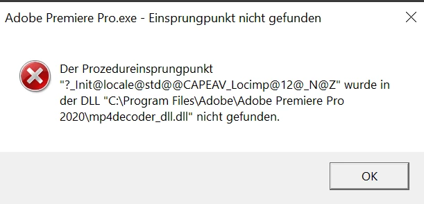 Der Prozedureinsprungpunkt "?_Init@locale@std@@CAPEAV_Locimp@12@_NZ" wurde in der DLL "C:\Program Files\Adobe\Adobe Premiere Pro 2020\mp4decoder_dll.dll" nicht gefunden