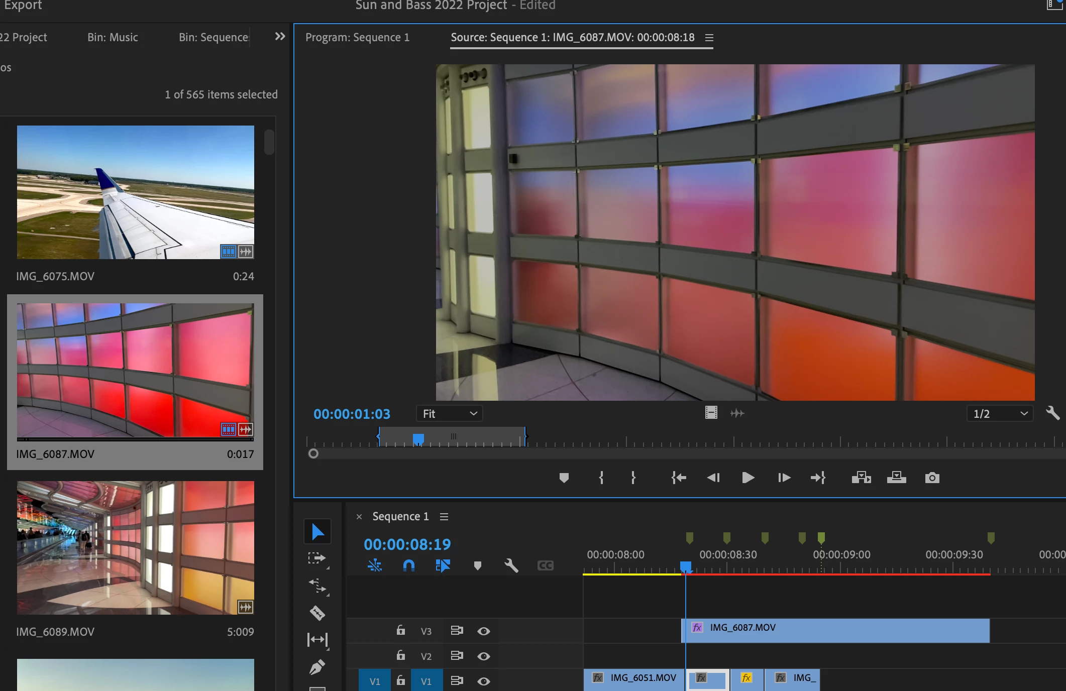 Below are screenshots comparing the clip (IMG_6087) from the Project panel to both the Source and Program panels (where the clips shows a duller color).