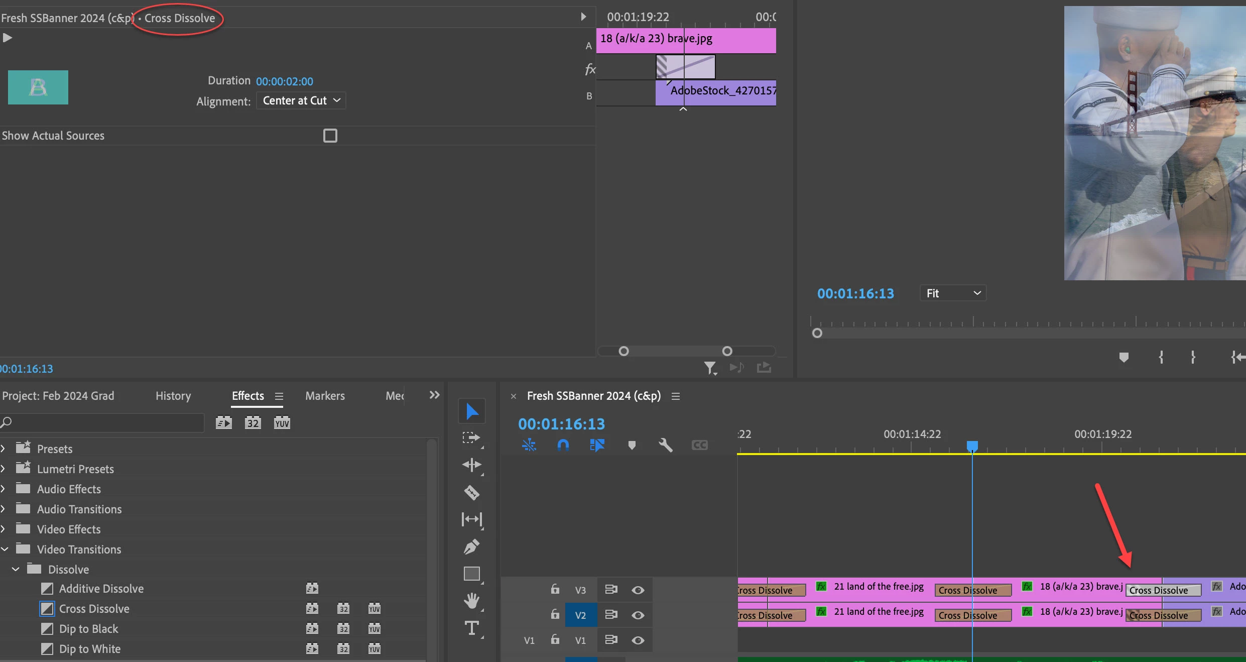 The only thing that works is shortening the length until it is out of the problematic (diagonal-lined) area, but I would like to keep the transition lengths consistent. Any ideas as to why this little area is causing problems? Note: the purple clip is a video clip (.mp4).