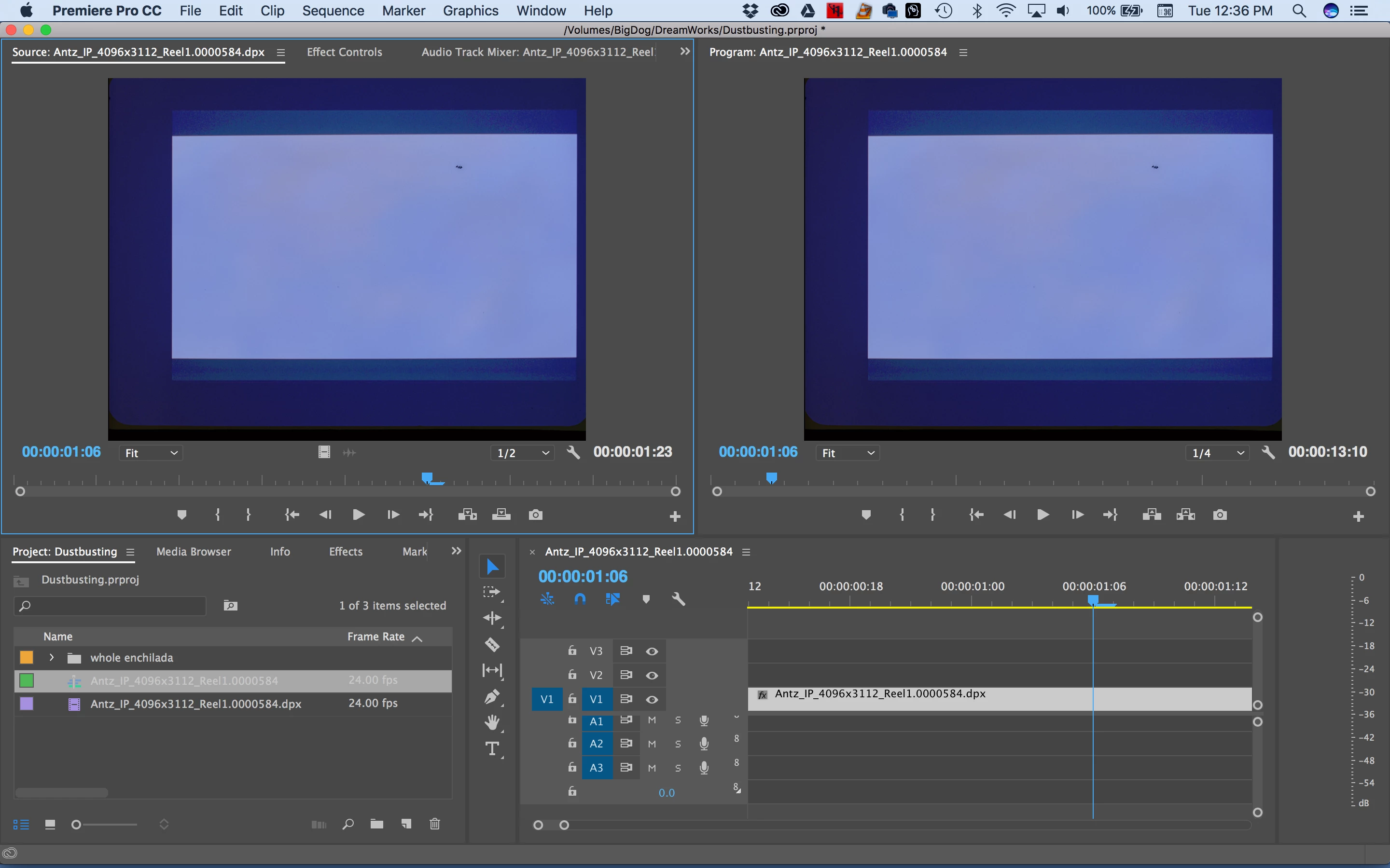 I'm working on a project that involves cleaning up dust on frames that were scanned from film. After various experiments we found that Photoshop was the best tool for the job but going through tens of thousands of frames to find the few frames that needed attention was taking far too long. So I had an idea, play the reels through Premiere and open the problem frames with Photoshop. Seems very straight forward, doesn't it?